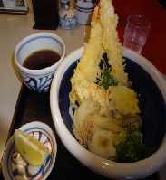 そこのお店で一番人気のひや天うどんを注文し食べると「めちゃうま!」うどんはもちもちとして歯ごたえがある。
